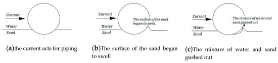 Sediment initiation is the first step in the whole scour process. Sumer [17] divided the piping phenomenon in the initial stage of pipelines scouring into two stages by studying the details of scouring. In the first stage, when the incoming stream acts for a period of time, the seepage force of water in the seabed begins to be greater than the floating weight of particles, and the surface of sand begins to uplift. In the second stage, piping occurs, that is, a mixture of water and sand will gush out the piping. The piping process is shown in Figure 1a–c. Previous studies on sediment initiation generally simplified the seabed surface as a rigid impermeable boundary, ignoring the influence of seepage on the mobility of bed particles. To reveal the physical law of sediment initiation in the early stage of scour of free-spanning pipelines, Xia [18] analyzed the influence of seepage force generated by wave seepage in the boundary layer on sediment starting. Zhen [19] proposed a numerical simulation method that couples the shear stress sediment transport turbulence model with the porous seabed model. Studies showed that as the vortex around the pipe periodically forms and falls off, the bottom of the sea generates oscillations and residual excess pore pressure. In some cases, the vertical gradient of the superpose pressure (seepage force) significantly affects the fluidity of the bed particles around the pipe. Mattioli et al. used numerical calculations to study the turbulence and vortices of the local scour of submarine pipelines laid on a non-cohesive sandy sea floor under the action of stable water flow. The numerical model uses the level set technique to solve the Navier–Stokes equation. The model predicts the behavior of moving sediment through two components of drift force and lift force [20].