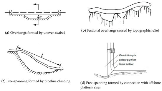 In the process of laying submarine pipelines, some regions will have considerable changes in submarine topography. This type of free span shows different spanning forms due to the differences in topography and geology of the route area [68,69], as shown in Figure 2.