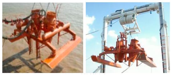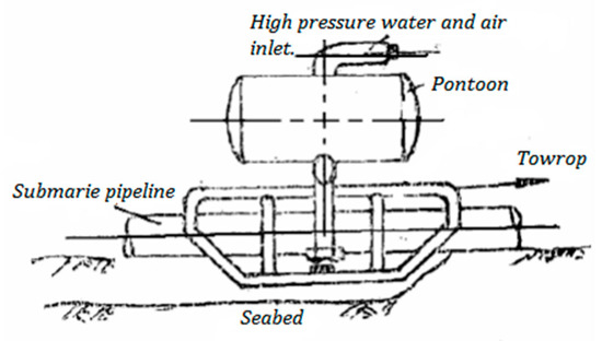 The jet trencher sprays the soil at the bottom of the pipe with high-pressure water to form a trench under the pipe. When the suspended length of the pipeline exceeds the critical value, it will sink to the bottom of the ditch under its own gravity. Water flow is then used to back silt the pipeline to create landfill [77]. At first, the exploitation of marine oil and gas resources was mainly concentrated in offshore areas. The soil in these areas is dominated by soft silt and the working water depth is shallow. Therefore, jet trenchers were mainly used at first. The first generation jet trencher has a simple mechanical structure, as shown in Figure 4.