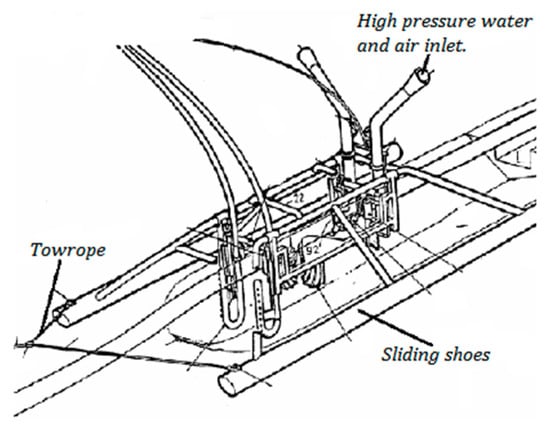 The second-generation jet trenchers have slide shoes added to the original structure and the shape and position of the nozzle were changed to achieve a better trenching effect. Its structure is shown in Figure 5 [78].