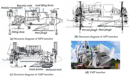 To enhance the adaptability of trench diggers to seabed geology, various mechanical trench diggers have been developed [80,81]. When a plough trencher is used for pipeline laying, the trencher is pulled along the pipeline-laying path by a water towboat with a tow rope, the plough is trenched on the sea floor, and the soil is turned over on the bottom of the trench. Then, the pipe is placed in the trench. Relying on the current, the mud accumulated on both sides of the ditch is flushed to bury the pipeline [82,83,84,85]. The idea for a submarine trench excavator was introduced in the 1970s. After more than 40 years of development, various types of submarine trench excavators have emerged for the optimization of seabed soil hardness, seabed working depth, and economic benefits. In 1976, the world’s first pre-trenching submarine trencher was developed, which successfully dug trenches at a depth of 150 m [86]. In 1989 and 1990, Soil Machine Dynamics Ltd. (SMD) developed the modular plough system (MPS) [87,88] and advanced pipeline plough (APP) [89,90] for Stolt Offshore, respectively, as shown in Figure 7a,b. In 2004, CTC Marine developed a trench digger called advanced multi-pass plough (AMP) [91,92]. As shown in Figure 7c, this trench digger has the addition of a high-pressure injection system similar to that of a jet trench digger, which can reduce the cutting force and cope with viscous sands via high-pressure injection on the cutting surface of the plough body. In 2006, SMD developed the latest generation of trencher, the variable multi-pass plough (VMP), as shown in Figure 7d. This trencher adopts hi-tow point technology and has variable stroke [93].