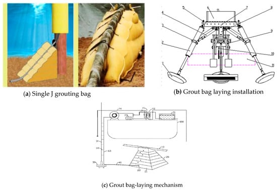 The grouting bag method involves placing a supporting shell membrane on the surface of the sea floor and then injecting mud into the grouting bag using the grouting equipment on the mother ship to complete the support of the span section of the pipeline [94]. The advantages of this method include simple and easy construction, high economic benefits, and no damage to the pipeline. The disadvantage is that, over time, the scouring action of waves and currents may cause the grouting bag to sink. After sinking, it no longer provides support for the spanned pipeline. Found Ocean, a British company, is the world’s largest offshore construction and grouting company that provides design, manufacturing, and installation services for various types of grouting bags. Figure 8a shows Found Ocean’s J-type grouting bag, which was successfully assembled with remote operated vehicle (ROV) at a depth of 1244 m underwater. Figure 8b depicts a schematic diagram of a grouting bag laying device invented by Wang et al. [95] in 2015, and Figure 8c depicts the grouting bag laying device invented by Song et al. [96] in 2016.