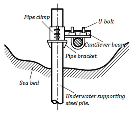 The current supporting piles are mostly cantilever beam structures. To fix the cantilever beam, a pipe bracket is generally pre-welded on the supporting pile. After the support pile is driven, the diver measures the relative position of the tube holder and the suspended pipe. Then, the prefabricated cantilever beam and the pipe clamp are fixed on the pipe bracket according to the actual measurement size. Finally, the diver fixes the suspended pipeline to the cantilever beam with high-strength U-shaped bolts. This method is mainly manual and difficult for divers. For the treatment of deep-water span pipelines, the operation by divers is more difficult.