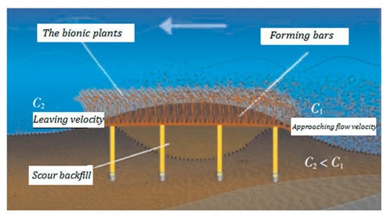 After the bionic grass and its mounting mat are firmly anchored at a predetermined position on the sea floor where erosion needs to be prevented or controlled, the bottom water flows over this bionic water grass. Due to the flexible viscous damping effect of the bionic grass, the flow velocity is reduced, which slows down the scouring effect of the water on the sea floor. Due to the decrease in the flow velocity and the obstruction created by the bionic aquatic plants, the sediment entrained in the water stream is continuously deposited on the bionic aquatic plant installation mat under the action of gravity, gradually forming seabed sandbars enhanced by bionic grass. As such, the scour of the sea floor near the submarine pipeline is suppressed [106]. When using bionic waterweed technology to treat submarine overhang pipelines, the scoured trenches at the bottom of the pipeline need to be backfilled first with sand and gravel. After leveling, the bionic waterweed is installed on the backfill layer. Bionic water grass technology has achieved good results in the management of submarine spanning pipelines in Shengli Chengdao Oilfield and Nanpu Oilfield [107]. Li et al. [108,109] invented a new floating curtain-descaling device that can slow down the flow rate of water. When the water-carrying sediment flows through the sand window, the flow rate decreases and the sediment can be deposited under the action of gravity, thus covering the pipe.