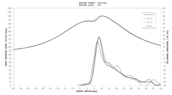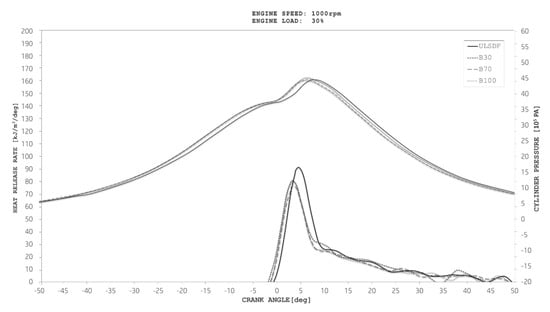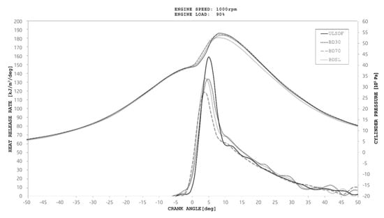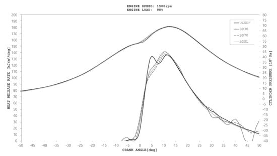 The average values of the measured data for various fuel mixtures are given on Figure 2, Figure 3, Figure 4, Figure 5, Figure 6 and Figure 7. More than 100 measuring cycles were performed in order to reduce in this way an influence of random changes during the experiment [,,]. It is visible from Figure 4 and Figure 7 that the value of pressure inside the cylinder decreased with higher engine operational loading in the case of increasing proportion of biodiesel in the experimental fuel. The curves, which describe the intensity of heat generation, are various in the operational regime utilizing the ULSDF and the biodiesel fuel mixture. The pressure value inside the cylinder grew more rapidly for the fuel mixture biodiesel–ULSDF compared to the clean ULSDF. The cetane number that belonged to the biodiesel and also the value of flame speed were higher in comparison with ULSDF. The speed of heat release was reduced with the increasing amount of biodiesel in the tested fuel mixtures and the ignition delay decreased if the volume of the biodiesel in the tested fuel was higher.