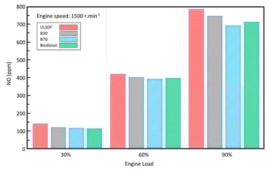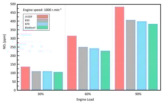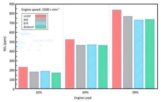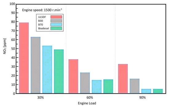 - The emissions of NO are higher if the engine loading level increases, but these emissions are decreasing with higher amount of biodiesel in the experimental fuel. The NO2 emissions are significantly minimized if the engine loading level is increased and if amount of biodiesel in the experimental fuel is higher.