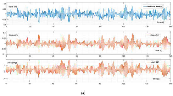 Examples of the time series of 140 s registration of the wave, heave, and pitch at Fr = 0.4 in the head and following seas are given in Figure 5a and Figure 6. These show the appreciated different number of wave encounters, and consequently of heave and pitch oscillations for the same registration time in the head and following sea. In Figure 5b, measured accelerations at center of gravity CG and at the bow are given. In the following waves, the measured accelerations were very low, and the signals were noisy, so for the sake of clarity, these data have been neglected for the further comparisons. It can be noted from Figure 5b that the accelerations are normalized by g, so they oscillate around 1g value.