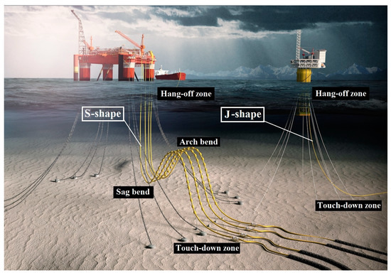The metallic pipeline is one of the primary devices for oil and natural gas production and transportation in the offshore industry. It has been widely applied owing to the advantages of cost-effectiveness, simplicity, ease of installation, and maintenance. Maintaining the structural integrity of offshore metallic pipelines is of great importance to guarantee operational safety. While as a matter of fact, offshore metallic pipelines are prone to the fatigue problem due to a variety of environmental and operational dynamic loads [1,2]. For instance, there are two typical layouts of offshore metallic pipes: the S-shape and the J-shape (as shown in Figure 1), where the critical areas, i.e., hang-off zone, touch-down zone, sag bend, and arch bend, seriously suffer from fatigue problems under dynamic loads induced by waves, wind, currents, 2nd order floater motions, and unstable internal pressure [3,4].