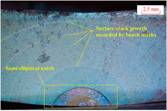 Crack growth detection and measurement approaches are significant to acquire valid crack growth data. The beach mark (BM) technique, which might be the most reliable and efficient method of tracing surface crack growth, has been widely adopted, as indicated in Table 2. The BMs, which are usually obtained by changing the stress amplitude or load ratio, can be reserved permanently on the surface crack cross-section plain, as shown in Figure 6. In addition, the BMs are not influenced by the covering on metallic pipes (e.g., coating, composite repair), which widens its application scope. The electric potential drop (EPD), particularly the alternating current potential drop (ACPD), was adopted in Ref. [23,24] as well. This method is efficient, and while measurement errors still exist, it can be used as an alternative or a supplementary detection method.