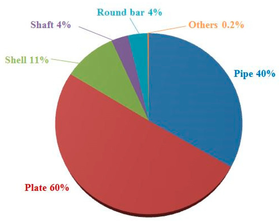 Hence, surface crack growth is a huge threat to the structural integrity of metallic pipes, which has drawn wide attention from the offshore industry and academia. In our review effort, searching the SCOPUS and Google Scholar using “surface crack” or “part through crack” and “pipe” as well as their synonyms as key terms, plus by applying the forward and backward snowballing techniques [13], we selected the related topics regarding the issue of surface crack growth in metallic pipe structures. Figure 3 shows the research status on different surface cracked structures, where 60% of the research is on cracked plates. The research on pipe structures (including pressure vessels) accounts for 40%, which is the second biggest research hotspot.