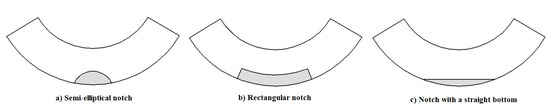 Notch type: (a) semi-elliptical notch; (b) rectangular notch [23], and (c) notch with a straight bottom [25].