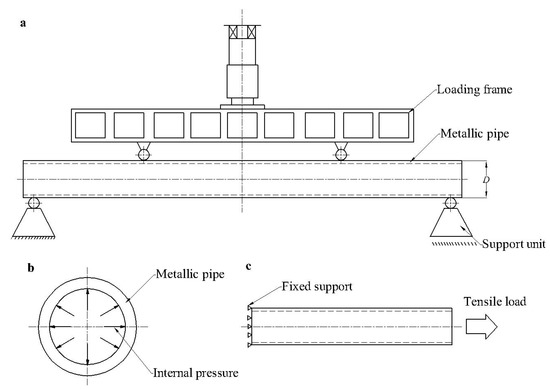 Test set-up and load cases: (a) 4-point bending, (b) internal pressure, and (c) tension.