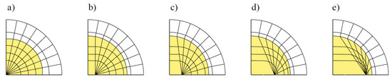 To date, the majority of numerical simulations of surface cracks in metallic pipes have been conducted with the FE method (FEM), as shown in Table 3. The implementation and accuracy of the FEM are the major concerns, guaranteed by several aspects: modelling, element type choosing, meshing methods, the element size, and the solver algorithms. First, the contour numbers around the surface crack might affect the calculation results. At least two contours around the crack front are suggested in order to eliminate the errors [46]. Second, a spider web pattern of the meshing shape consisting of several concentric rings around the crack front is recommended, and the minimum angular discretisation of the elements should be [47]. Third, when using the displacement matching method to estimate SIFs, the orthogonal mesh (see in Figure 8a) around the crack front should be adopted, while if the energy based method is applied, the non-orthogonality mesh (see from Figure 8b–e) would not affect the results [48]. Fourth, the type of element commonly adopts the iso-parametric elements, with quadratic shape functions [49]. The iso-parametric elements can present curved shapes with a small number of elements owing to their distorted shapes. Fifth, the element size, especially for those around the surface crack tip, should be defined properly. For different model geometries, an investigation on the proper element size is necessary to guarantee the accuracy of SIFs evaluation and to save the computing time [50]. Last but not least, the interaction angle between the crack front and the free surface of the pipe should be carefully modelled in order to ensure the square singularity at the corner point [51]. More information on the FE modelling of three-dimensional cracks can be referred to in the review paper by Branco, et al. [19].