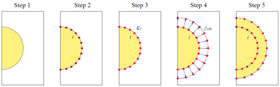 Along with crack growth models such as Paris’ law [55], the propagation of surface cracks can be traced. This method is generally known as the adaptive re-meshing technique, which can be summarised into five main steps [19], indicated in Figure 9: Step 1: building a three-dimensional FE model; Step 2: dividing the crack front into a certain amount of nodes; Step 3: calculating the effective SIFs along the surface crack front; Step 4: choosing the adequate fatigue crack growth law and calculating the crack growth; and Step 5: defining a new crack front of a new FE model. These steps are then repeated until the crack propagates to a required crack length.