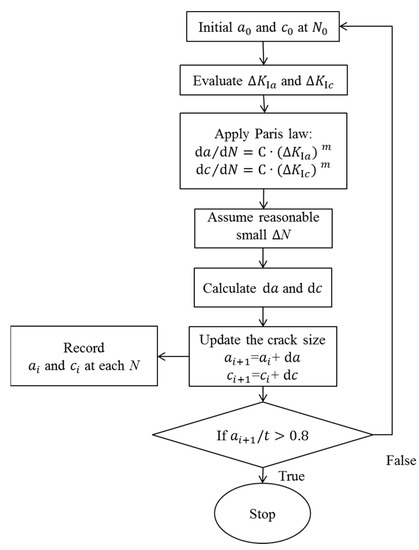 The surface point and the deepest point are the two most important points along the surface crack front. In general cases, only the crack growth along the depth and length directions need to be evaluated. The procedure of tracing the crack growth process along the depth direction and the length direction is shown in Figure 10. and are the crack growth rate along the depth direction and along the length direction, respectively; and are the range of stress intensity factors of the deepest point and the surface point, respectively; and C and m are two Paris constants. Afterwards, by assuming a small amount of cycles, the increments of the crack length and depth are calculated. Eventually, it is possible to trace the surface crack growth along the two directions.