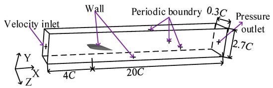For all the numerical simulations in the present study the Star-CCM+ software was used. A NACA66 hydrofoil was used in this work, which has a chord length C = 0.15 m and a span of 0.192 m. The angle of attack of the hydrofoil is 8°. The computational domain is shown in Figure 1. The velocity inlet of the computational domain is approximately 4C from the leading edge of the hydrofoil and the inflow velocity is V∞ = 5.33 m/s, with a Reynolds number of Re = 0.8 × 106. The outlet pressure can control the reference pressure of the flow field to adjust the cavitation number. The cavitation number is defined as: