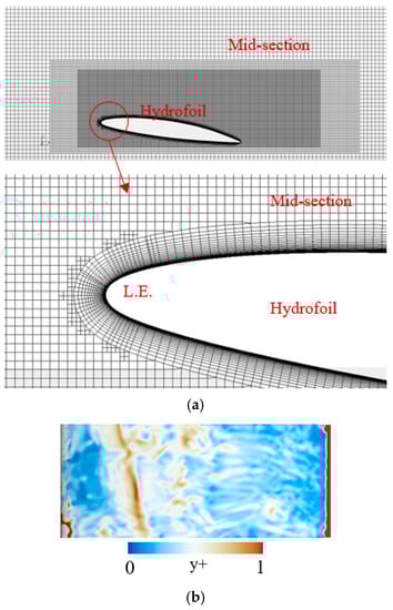 Figure 2a shows the mesh of the computational domain. The mesh is generated by the Star-CCM+ auto trimmed mesher and prism layer mesher. Transition area between prism layer mesh and trimmed mesh is unstructured type, and structured mesh is generated in other regions. The total number of mesh elements is approximately 3 × 106 and the y+ < 1 over the hydrofoil surface to meet quality criterion requirements for LES, as shown in Figure 2b.The time step for the calculation is set to to ensure stability in the numerical calculation.