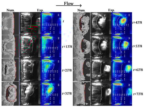 To validate the numerical model, results from the numerical simulation and a previous experiment [] were compared. In this experiment, numerical videos were used to record the cavitating flow, numbers of piezo-resistive transducers were used to measured pressure. Figure 5 shows the cavitation shape for a single cavitation cycle. T represents the period of cavity shedding. The numerical simulation accurately captured the periodic characteristics of the hydrofoil cavitation, such as the growing, shedding and collapsing processes. The cavitation shape is also well predicted by the numerical simulation. It shows that the numerical cavitation shape matches well with the experimental cavitation shape.