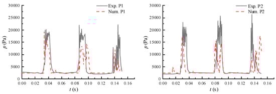 A collapse of the cavitation can lead to dramatic fluctuations in pressure. Thus, the dynamic pressure is difficult to predict. Numerical predictions of the pressure fluctuations at points P1 and P2 are plotted in Figure 6. As indicated by the experimental measurements, the pressure fluctuations caused by the cavitation collapse and the periodicity of the cloud cavitation flow are well predicted. The numerical prediction of cavitation shape and pressure results are highly consistent with experimental results indicating that the numerical method can effectively predict the unsteady cavitation dynamics.