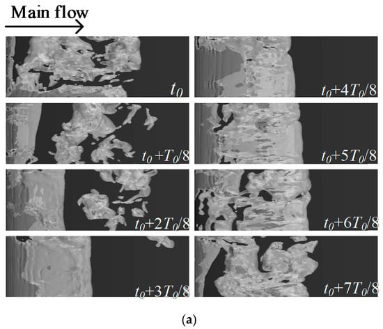 To evaluate the effect of a free surface on cavitating flows, Figure 7 shows the cavity shapes at eight typical times in one cycle for the cases of without free surface and near the free surface (h = 0.25C), where T0 and T1 represent the evolution cycles of without and with free surfaces, respectively.