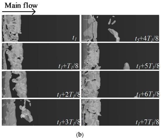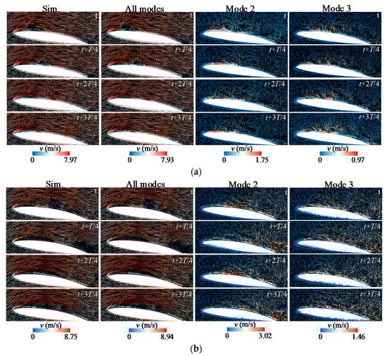 Reconstruction with different modes can result in flow patterns at different characteristic frequencies. In this way, the vortex motion characteristics of the flow field at different frequencies can be analyzed. Figure 13a shows the reconstructed flow field velocity vector over a single cavitation cycle near a free surface. The first column presents the numerical simulation results, and the second column displays the flow field reconstructed by all modes, which reflects the true state of the flow field. The flow field matches the numerical simulation results, demonstrating the effectiveness of the improved DMD method. Because mode 1 corresponds to a frequency of zero and it has no periodicity, it is not analyzed here. The third and fourth columns present the reconstructed flow fields for mode 2 and mode 3, respectively. It can be seen that in addition to mode 1, the coherent structure of the single-order mode is embodied as a vortex in the reconstructed flow field. Over a single period, a vortex structure is observed inside the sheet cavitation on the suction side of the hydrofoil. As the cavitation sheds off and transitions to cloud cavitation, the tails of the sheet cavitation form new vortices and move downstream. The scale of the vortex decreases as the dynamic mode increases, similar to the mode coherent structure. When there is no free surface, as shown in Figure 13b, the reconstructed flow fields of all modes are also similar to the numerical simulation results, which express the true state of the flow field. Compared with the near free surface case, in addition to the difference from the real flow field, the reconstructed flow fields for mode 2 and mode 3 exhibit significant deviations. In the absence of a free surface, the vortex formed by the shedding cavitation appears at a position further downstream, and the scale is larger than that near the free surface. This phenomenon indicates that the free surface has an inhibitory effect on the vortex generated by the cavitation, resulting in a reduced vortex scale.