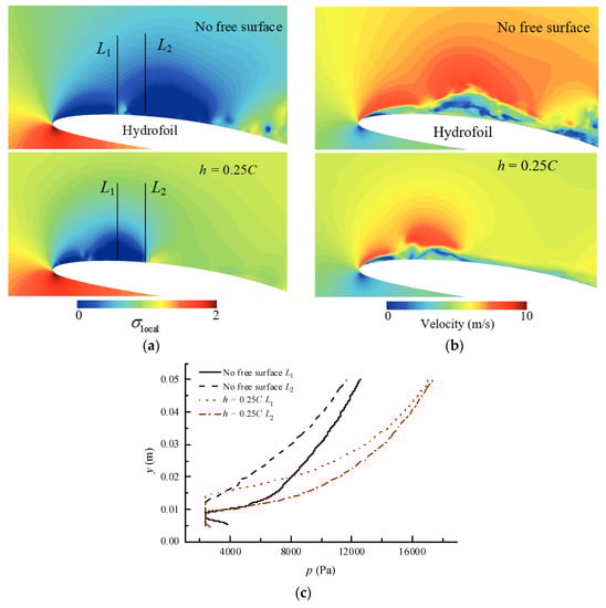 Figure 8a shows the local cavitation number and Figure 8b shows the local velocity field on the mid-section plane of the computational domain. The local cavitation number near the cavitation zone is close to zero. As the distance from cavitation increases, the local cavitation number increases, indicating that a cavitation is more difficult to produce. Changes in the cavitation number represent changes in absolute pressure. It can be seen from the corresponding local velocity field that the high speed area under no free surface condition is larger than near free surface condition. This indicates that the existence of the free surface reduces the velocity of the flow field around the hydrofoil and resulting in a weaker cavitation intensity. Two straight lines L1 and L2 are set along the y-direction at x/C = 0.2 and 0.3. The pressure value of L1 and L2 as the x coordinates, and the vertical distance from the hydrofoil head is the y coordinate, as shown in Figure 8b. When the value of y is small, the pressure is small due to the cavitation. The pressure increases as y increases. When y = 0.05 m, the pressure under the near-free surface condition is larger than no free surface condition. The results show that the pressure increases faster near free surface. Near the suction surface of the hydrofoil, the free surface makes the pressure change more drastic, which leads to a larger local cavitation number. Subsequently, it is difficult to generate a cavitation, and the cavity length is reduced.