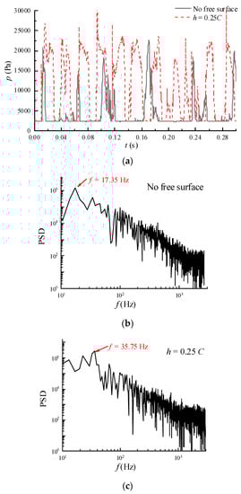 Pressure fluctuations and the corresponding PSD at P3. (a) Pressure fluctuation on the suction surface of the hydrofoil at P3; (b) PSD of the pressure fluctuation at P3 for the no free surface case; (c) PSD of pressure fluctuation at P3 for the near free surface case.