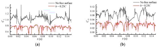 Comparison of the lift and drag coefficient fluctuations for the no free surface case and the near free surface case. (a) Lift coefficient; (b) Drag coefficient.