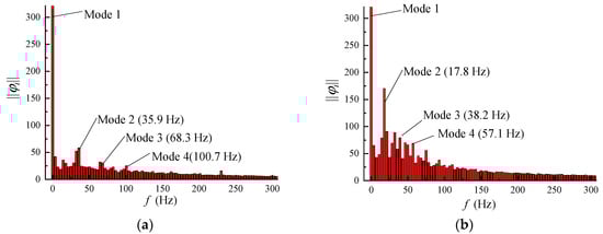 Figure 11 shows an energy spectrum of the dynamic modes. Mode 1 corresponding to a frequency of zero contains most of the energy of the flow field. Mode 2 contains the second greatest amount of energy in the flow field, and the corresponding frequency is close to the cavitation shedding frequency (35.75 Hz and 17.35 Hz) obtained in the previous section. The frequencies corresponding to mode 3 and mode 4 are close to two and three times of mode 2. Due to the strong instability of the cavitation flow field, the frequencies for mode 3 and 4 are not strictly two or three times the dominant frequency, which is acceptable. As shown in Figure 10a,b, for the near free surface case, the modes except for mode 1 contain significantly less energy than the no free surface case. This result indicates that the free surface inhibits the cavitation flow, which may explain why the length decreases for the near free surface cavitation case.