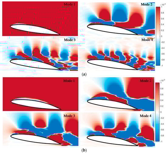 Figure 12a,b show the distributions of the real part of the dynamic modes on the mid-section plane. Mode 1 corresponds to an average flow field with a frequency of zero. The real part is negative only near the hydrofoil. The region of negative values is similar to the sheet cavitation region, and most other areas exhibit positive values. The positive and negative values alternately appear in couples for modes 2–4, reflecting the coherent structure of the turbulence. This phenomenon is due to the periodic development of the hydrofoil cavitation, which is caused as the vortex rolls up and sheds off. As the frequency increases, the scale of the coherent structure becomes smaller. Compared with the case shown in Figure 11a in the absence of a free surface, the dynamic mode scale is larger near the free surface, as shown in Figure 11b, and the coherent structure regions have a larger range. This phenomenon may arise because the turbulence generated by the hydrofoil near the free surface is not fully developed due to the influence of the free surface. Moreover, the energy contained in modes 2–4 is less when it is near the free surface.