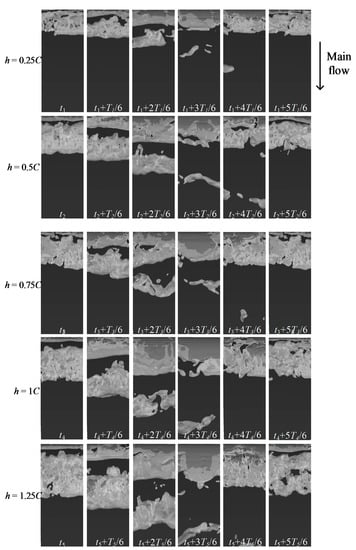 Figure 14 shows the cavity evolution for a typical cycle at five different depths. Similar typical cavitation characteristics can be observed in all cases: At t1, the sheet cavitation begins to develop downstream of the leading edge of the hydrofoil. Also, the cloud cavitation reaches its maximum. From t1 to t1 + 3T1/6, the sheet cavitation develops and reaches its maximum at t1 + 3T1/6. The cloud cavitation moves downstream and becomes smaller because of collapsing.