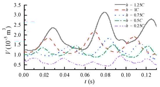 The cavity volume fluctuations proved the above conclusion, which is shown in Figure 15. Five complete cycles have passed before the results are recorded, and the results are convergent. The peaks of periodic fluctuations under the same working conditions are different, indicating that cavity evolution is a strong unsteady phenomenon. Although it exhibits a certain periodicity, the flow characteristics of each cycle are not exactly the same. The cavity volume increases with increasing depth from the free surface, indicating that the effect of the free surface on cavitation decreases as the depth from the free surface increases. As the depth from the free surface increases, the fluctuations of the cavity volume become more obvious. It indicates that the volume of the cavitation shedding is larger, which is consistent with the conclusion obtained in Figure 14. Hence, the free surface inhibits the development of cavitation, leading to a reduction in cavitation volume.