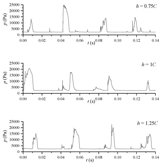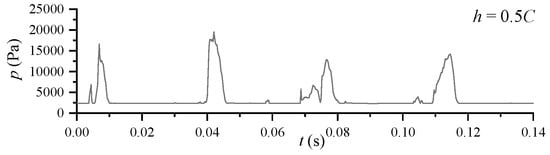 As mentioned above, the depth from the free surface affects the shape of the cavitation, and changes in cavitation shape alter the fluctuation characteristics of the pressure. Based on the pressure fluctuations of case 2 (h = 0.25C) shown above, Figure 16 presents the pressure fluctuation on the suction surface of hydrofoil at P3 with the other cases. Since the cavitation phenomenon is highly unstable, the pressure fluctuations obtained by numerical simulation are not stable at the peak. The fluctuation of the pressure is generated when the sheet cavitation is cut off by the re-entrant flow. When the sheet cavitation breaks off, and the cavitation again covers the monitoring point, the pressure value will be smooth close to the saturated vapor pressure. Moreover, the fluctuation of the pressure curves expresses the different frequencies of the cavitation cycle. It can be seen that as the depth of the hydrofoil increases, the frequency of the cavity shedding decreases, gradually approaching the frequency of the cavity shedding when there is no free surface. This result further demonstrates that the free surface inhibits the evolution of the cavity and increases the frequency of cavitation shedding.