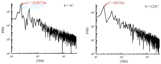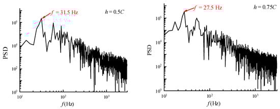 The corresponding PSD is shown in Figure 17. The maximum value of the curve represents the frequency of the cavity shedding. The pressure fluctuations in Figure 16 show that the duration of a cavitation period increases as the depth below the free surface increases, and thus, the frequency decreases, as verified by Figure 17. The frequency of the cavitation shedding period was extracted for each case. It can be seen that as the depth of the hydrofoil increases, the frequency of cavitation shedding decreases. This result may be attributed to the near free surface condition, the reduced cavitation length, and the reduced time required for development and shedding.