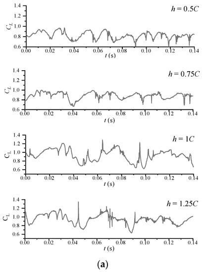 The effect of the free surface on the hydrofoil cavitation length also affects the lift resistance of the hydrofoil, which is an important factor for assessing the extent to how the free surface affects the cavitation and hydrofoil. Figure 18a shows the lift coefficient of the hydrofoil. It can be seen that the lift coefficient exhibits periodic fluctuations, consistent with the cavitation shedding period. The coefficient also shows strong instability, which is related to the unsteadiness of cavitation. To study the relationship between the different depth and the lift coefficient, the average lift coefficients for each operating condition is shown in Figure 18b. It can be seen that the average value of the lift coefficient decreases as the depth from the free surface decreases, which results that the relationship between lift coefficient and depth is linear.