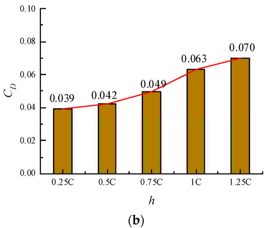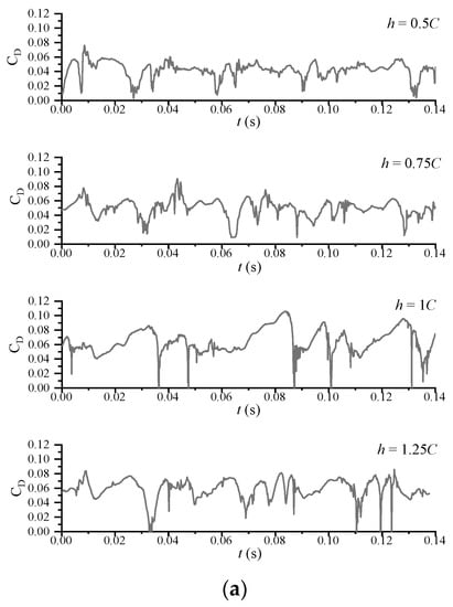 Figure 19a shows the drag coefficient of the hydrofoil at different water depths. The drag coefficient exhibits a cyclical trend similar to that of the lift coefficient curve, although the drag coefficient is much smaller than the lift coefficient. The average drag coefficient for different depths is shown in Figure 19b. As observed for the lift coefficient, the average drag coefficient increases with the increasing depth. Also the average drag coefficient has a linear development as the depth increasing.