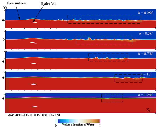 The effect of free surface on hydrofoil cavitation was analyzed above. Similarly, the cavitation of the hydrofoil near a free surface will also affect the free surface and form a wave. Figure 20 presents a water volume fraction scalar of the cross-section in the direction of the hydrofoil span of the hydrofoil at the same cavitation cycle stage. The shape of the free surface affected by the hydrofoil is shown in the figure. As the distance from the free surface increases, the influence of the hydrofoil on the free surface gradually decreases, and the liquid surface gradually becomes flat. In addition to the wave above the hydrofoil, the free surface behind the hydrofoil exhibits fluctuations, corresponding to the rectangular portion outside the dotted circle. As shown in Figure 20, as the depth of the hydrofoil increases, the turbulence at the hydrofoil tail also decreases. At the same time, the fluctuation of the free surface behind the hydrofoil is weakened. Hence, free surface evolution due to hydrofoil cavitation occurs not only above the hydrofoil, but also behind the hydrofoil.