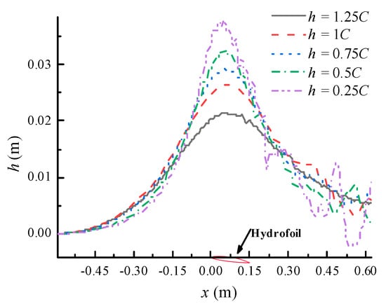 Positional information for the free surface was extracted from Figure 19 and is shown in Figure 21. The hydrofoil in the figure indicates the relative position of the hydrofoil under various working conditions and does not reflect the true depth. It can be seen that the wave height of the free surface above the hydrofoil decreases as the depth from the free surface increases. For h = 0.25C, 0.5C, 0.75C and 1C, the wavelength increases with increasing depth. However, for h = 1.25C, the wavelength is shorter than that for h = 1C. We speculate that there may be a transition point of the wavelength between h = 1C and h = 1.25C. At this point, the wavelength reaches a maximum above the hydrofoil. As a result, the effects of hydrofoil cavitation on the wave height are uniformly changed and there is a maximum wave length between h = 1.25C and h = 1C cases. We will carry out more detailed work in the future to study the mechanism of this situation.