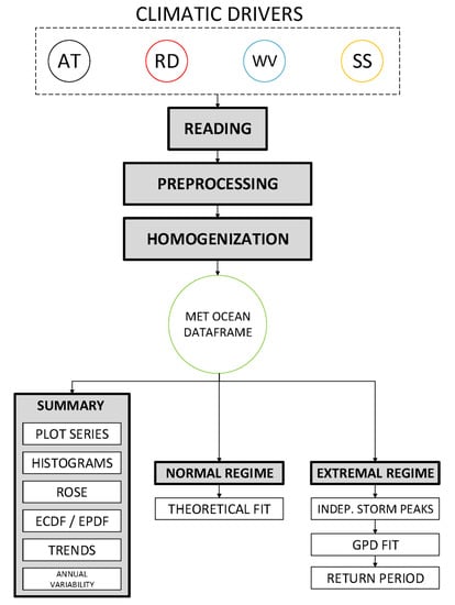 The tool consists of two main blocks, the first centered on data entry and pre-processing, and the second on data analysis. In turn, each of them is divided into three different modules, as shown in Figure 1. The first module of the pre-processing block allows the reading of data from various sources, from major European databases, such as Copernicus [], to numerical model outputs, such as WAVEWATCH III []. The tool then performs a quality analysis of the data and makes use of processing functions that have been specifically designed and incorporated for gap-filling or null value detection, among others. Since the tool reads data from multiple sources with different formats, it is necessary to homogenize these formats into a standard one so that the rest of the modules can work independently from the source of the original data. The developed format, named MetOcean DataFrame, is composed of a Pandas DataFrame plus a series of attributes, such as location, depth or forcing agent, among others.