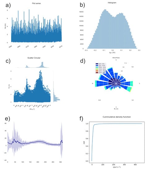 Graphical outputs obtained by the climate tool. (a) Time series plot of significant wave height. (b) Histogram of the astronomical tide. (c) Scatter plot of significant wave height and peak period. (d) Wind rose. (e) River discharge annual variability. (f) Empirical cumulative density function of the river discharge.