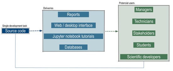 This methodology has enabled us to have a single source code to generate multiple products addressing different users (Figure 3). Moreover, a new addition to the source code is immediately available to all the products, and thus to every user. Deliverables currently available are tutorials in Jupyter notebooks, user-friendly automated reports or relational databases. Some of the potential users include public and private managers, specialized technicians, engineering students, stakeholders or other scientists.