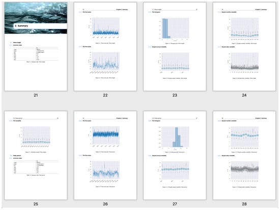 The developed tool allows the automatic creation of elaborate reports (Figure 4) that can be customized according to the specific needs of the user (Code 1). Thus, for example, the output language, the sections to be included, or the types of analysis to be carried out can be chosen by the end-user. Empty blocks are also included, in which the user can write (e.g., to discuss the results), that are respected each time the program is run. So, for example, if a new analysis is included or the length of the data time series is increased, when the code is recompiled and a new version of the report is obtained, the writing is not deleted.