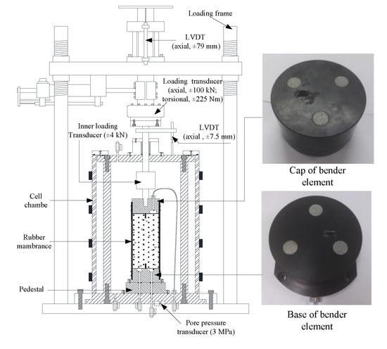 The measurement of shear wave velocity (Vs) or the associated Gmax was performed using a pair of piezoceramic bender elements (BE) installed in the cell chamber of a dynamic hollow/solid cylinder apparatus (HCA) [20], as shown in Figure 1. For each of the BE tests, a set of sinusoid signals from 1 to 40 kHz, rather than a single signal, was used as the excitation, and the received signals corresponding to these excitation frequencies were examined in whole to better identify the travel time of the shear wave, then, Gmax can be calculated as following [16].