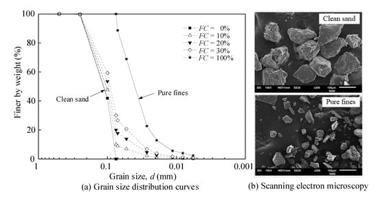 Scanning electron microscopy image and grain size distributions of clean sand, pure fines, and marine silty sand with different fines content: (a) grain size distribution; (b) scanning electron microscopy image.