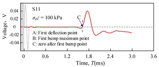 For the bender element tests, the 10 kHz excitation signal was found to consistently yield a clear arrival of the shear wave for both clean sand and silty sand with various FC, which is consistent with the test results of Yang and Liu (2016) [14]. Figure 3 presents a set of typical received signals captured from the bender element in different silty sand specimens. The first arrival time method was introduced to determine the shear wave travel time in this study [26,27,28], and the zero after first bump point corresponds to Point C marked in Figure 3, suggested by Yoo et al. (2018) [29] and Lee and Santamarina (2005) [30], was selected as the shear wave arrival time.
