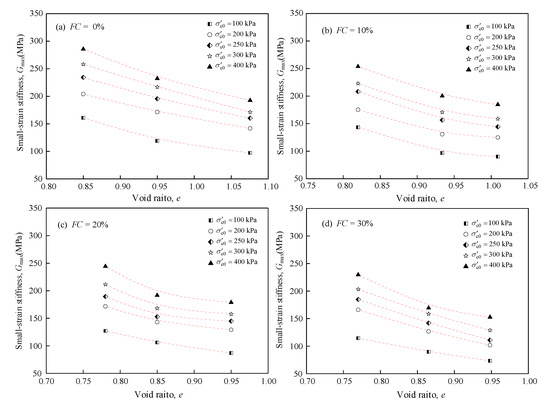 Figure 4 present the comprehensive view of the measured Gmax values of silty sand with different FC, e, and . A remarkable finding from the figure is that FC, e, or all has a significant impact on Gmax, the increase of e will significantly reduce Gmax for silty sand at different FC and . Furthermore, in each plot, the five trend lines describe the effect of e on Gmax, and the range of trend lines revealed the influence of varying . Under otherwise similar conditions, Gmax decreases with increasing e or FC, but increases with increasing FC. The existing explanation that: as e increases, the dense state changes from compact to loose, which reduces the amount of force chain between particles, contribute to a attenuation in the stiffness of silty sand; while at a fixed e, the amount of sand grains composed of soil skeleton is constant as FC increases, a certain amount of grains participate in the composition of soil skeleton, and the grain contact area increases, eventually leading to an increase in Gmax. In addition, the relationship between Gmax and e is insensitive to , but obviously sensitive to FC. According to Yang and Liu (2016) [14], there is a linear function relationship between Gmax with e for Toyoura silty sand, and the void ratio dependence appears to be similar to silty sand with different FC. Incorporating the test results in the study, an obvious soil-specific relationship between Gmax and e can be found, and a more comprehensive study needs to be conducted for addressing this concern.
