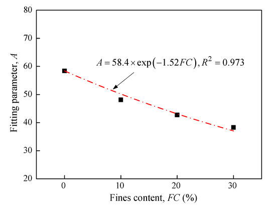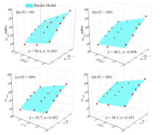 It is worth noting that the addition of FC will obviously alter the material-specific fitting parameter A, which describe the increment ratio of Gmax/F(e) caused by the increasing of (/Pa)n (Figure 7), and a fairly good exponential relationship can be given as following:
