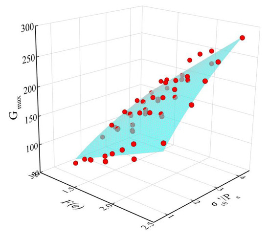 Figure 8 show the relationship between Gmax, F(e*), and normalized effective confining stress (/Pa)n of silty sands. Despite the variation in FC, e, or of the specimens, all of the test data points are located in a narrow surface, which means that e* appears to adequately capture the effects of FC, e, and particle gradations when FC < FCth. Therefore, the modified Hardin model based on the binary packing state parameter can be established: