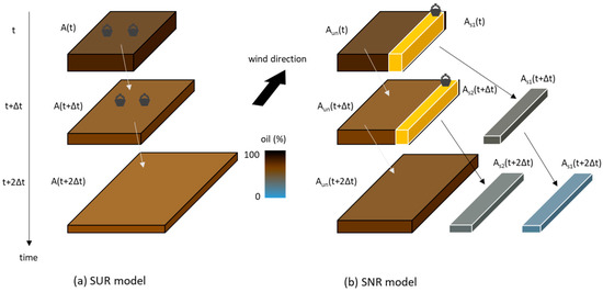 The SUR model considered reduction by both mechanical recovery and natural weathering, which includes evaporation and dispersion. The SNR model not only considered removal by recovery and weathering but also assumed that thin slicks (with a thickness of thinner than 0.6 μm) had been removed, as such slicks dissipate naturally from a response viewpoint [7,54].