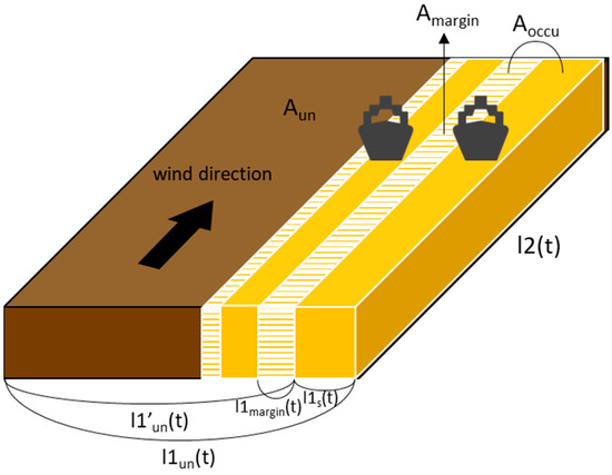 Next, the area change over time should be calculated separately in each zone because the spatial improvement distinguished the skimmed zone and unskimmed zone. The l1 of the unskimmed zone is updated to l1’un as in Equation (15). The l1un(t + Δt) is defined by adding the increase by spreading and wind, Δl1, to the length l1’un(t):